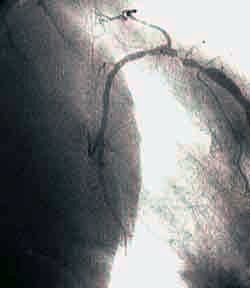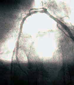 John’s angiogram showing the main Artery carrying blood from the heart, with over 95% blockage. Life expectancy with such a severe obstruction is 2 – 48 hours.